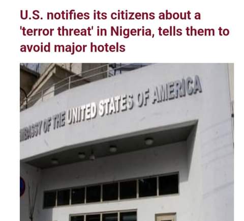 The United States government has issued a terror threat notice to its citizens in Nigeria, warning them about “elevated threats” in major hotels in the “larger cities” of the country.