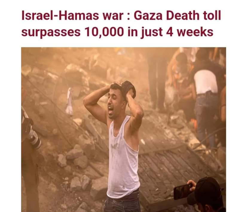 The conflict between Israel and Hamas has reached a gru£some milestone as more than 10,000 people have d!ed in Gaza in the four weeks since the conflict began.